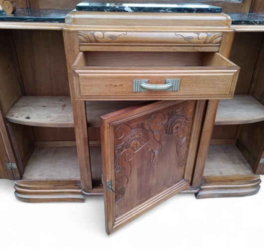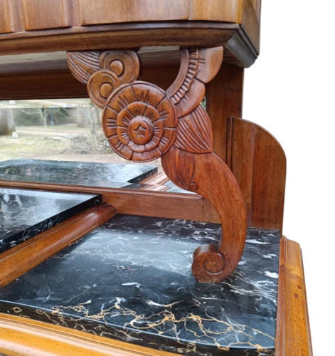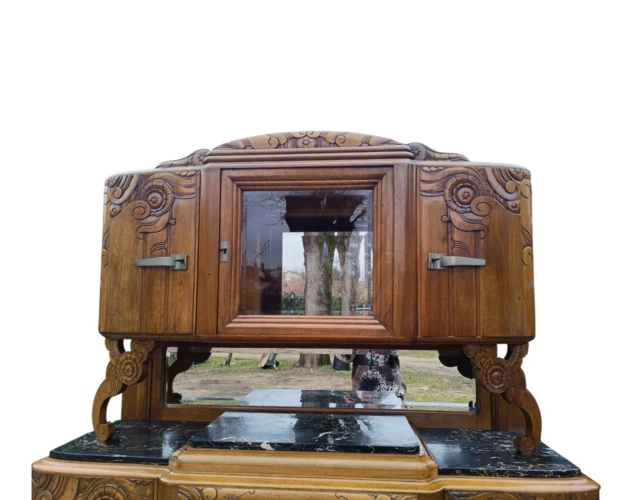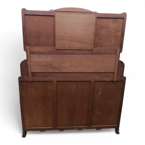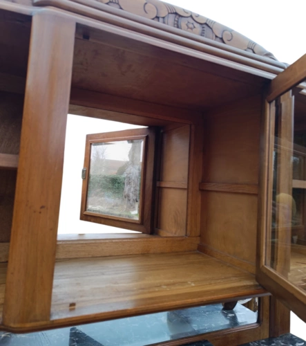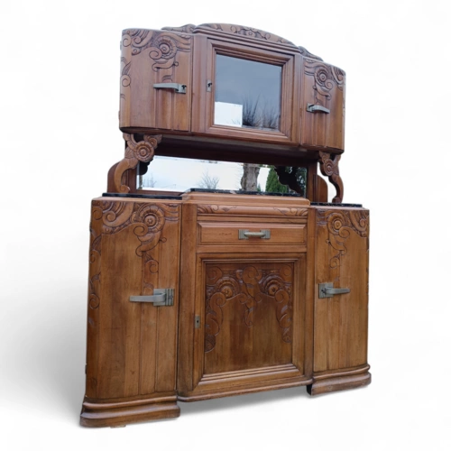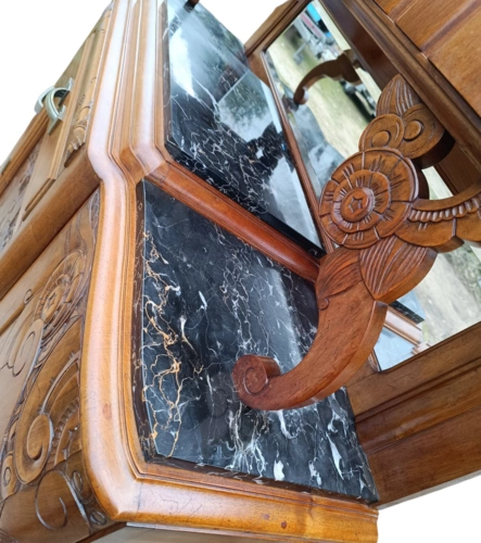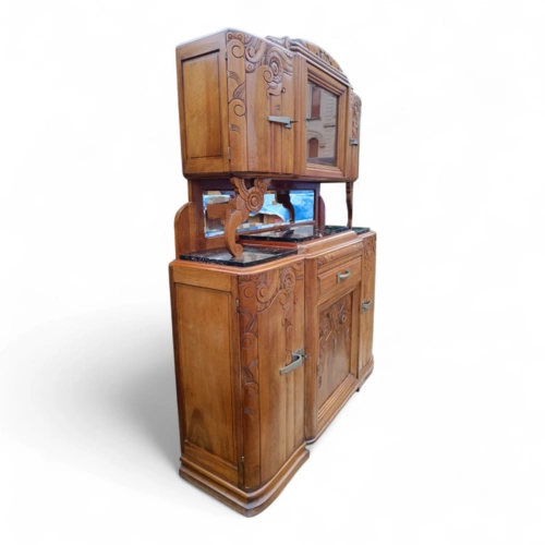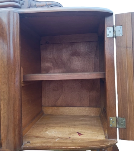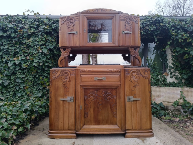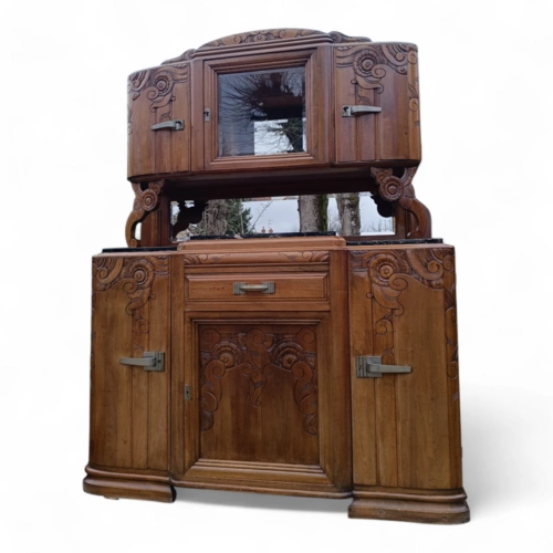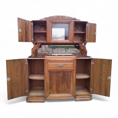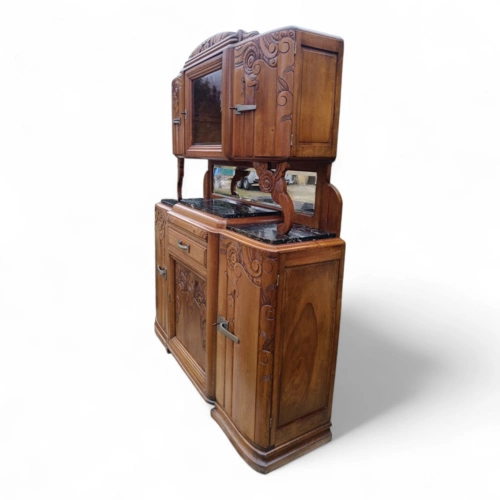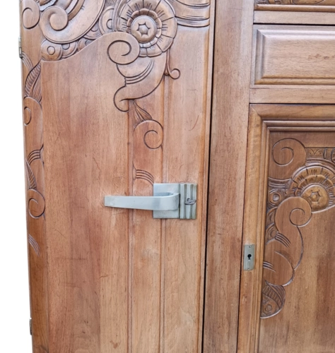Dieser antike Holzschrank bietet viel Stauraum und ist ein echter Blickfang für jedes Zuhause. Mit seinen kunstvollen Verzierungen und der hochwertigen Verarbeitung ist er ideal für Liebhaber von Antiquitäten.