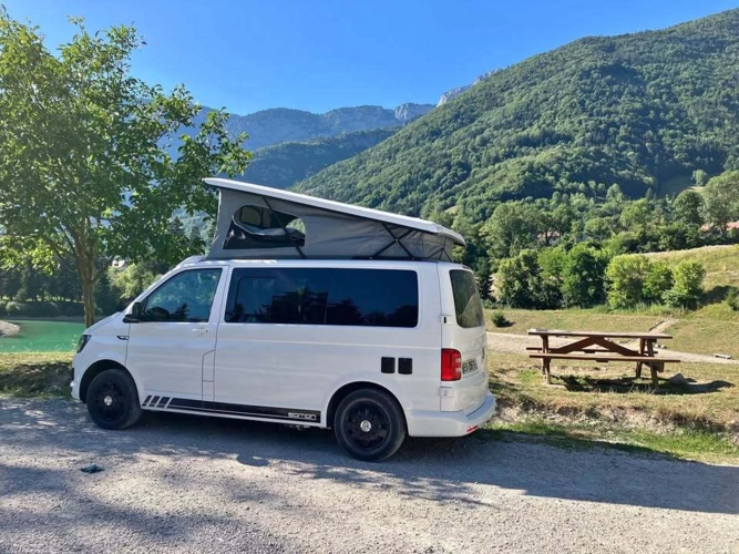 Je propose la location de notre Van aménagé haut de gamme par un professionnel, boîte auto DSG 7, panneau solaire, carrosserie impeccable. Carte grise VASP, radar de recul, sièges avant pivotants, 5 places