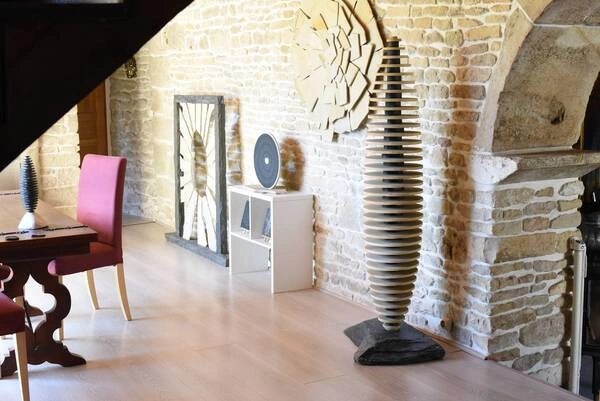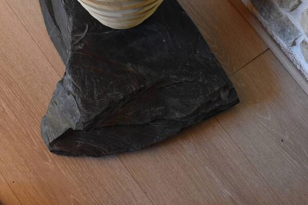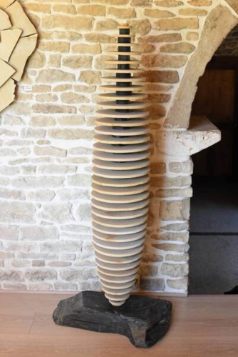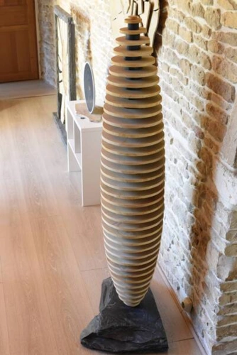 Sculpture composée de pierres en Grès beige et en Ardoise noire maintenues par une tige en inox sur un socle en ardoise noire et rouillée.